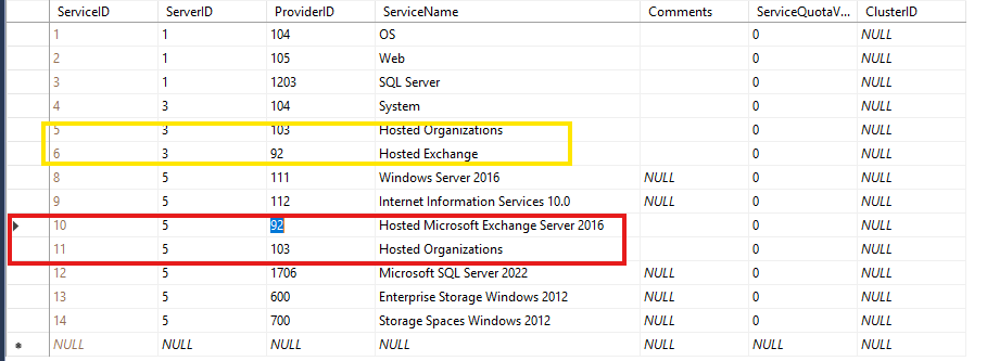 I checked my SQL database but I’m not really sure what I’m supposed to do. Here is a screenshot of the Services table: the old server is highlighted in yellow and the new server in red.